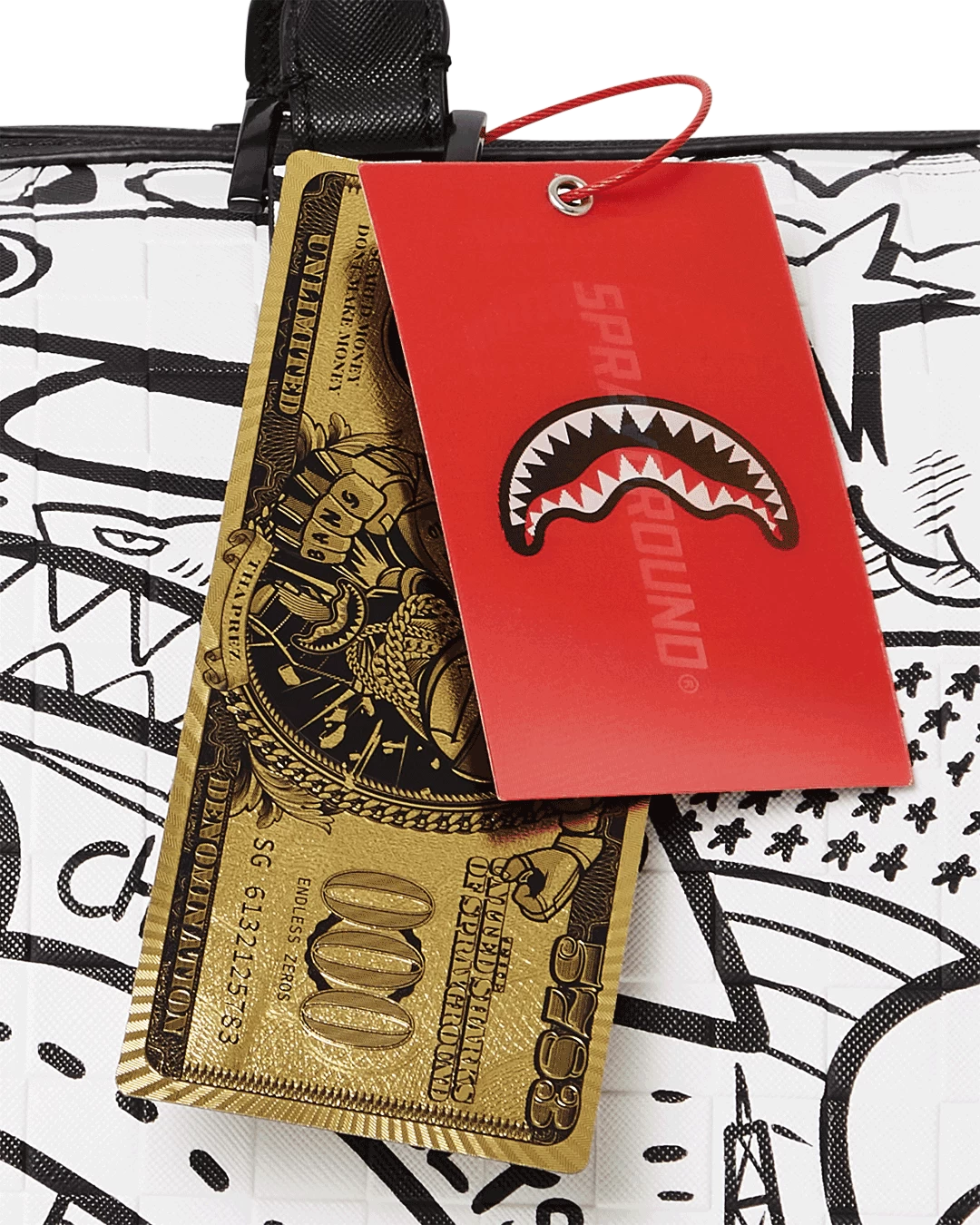 Dimensions: 20″ x 10″ x 10.75″ • Metal zipper pocket• Back Zippers •Zippered sneaker pocket • gold zippers • Adjustable Straps for custom sizing •Metal Zippers with Metal Hardware • bag of Sprayground money